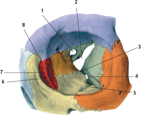 1 – зрительный канал; 2 – верхняя глазничная щель; 3 – глазничный отросток нёбной кости; 4 – нижняя глазничная щель; 5 – подглазничная борозда; 6 – передний слезный гребень; 7 – слезная борозда; 8 – задний слезный гребень