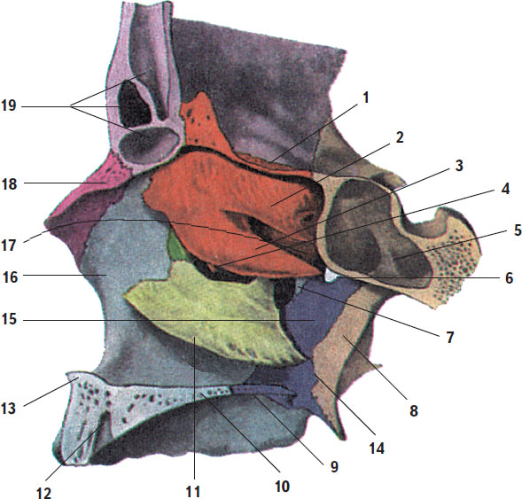 1 – решетчатая пластинка (решетчатой кости); 2 – верхняя носовая раковина; 3 – средняя носовая раковина; 4 – крючковидный отросток (решетчатой кости); 5 – клиновидная пазуха; 6 – клиновидно-нёбное отверстие; 7 – верхнечелюстная расщелина; 8 – медиальная пластинка крыловидного отростка; 9 – горизонтальная пластинка нёбной кости; 10 – нёбный отросток верхней челюсти; 11 – нижняя носовая раковина; 12 – резцовый канал; 13 – передняя носовая ость; 14 – нижний носовой ход; 15 – средний носовой ход; 16 – лобный отросток верхней челюсти; 17 – верхний носовой ход; 18 – носовая кость; 19 – лобная пазуха