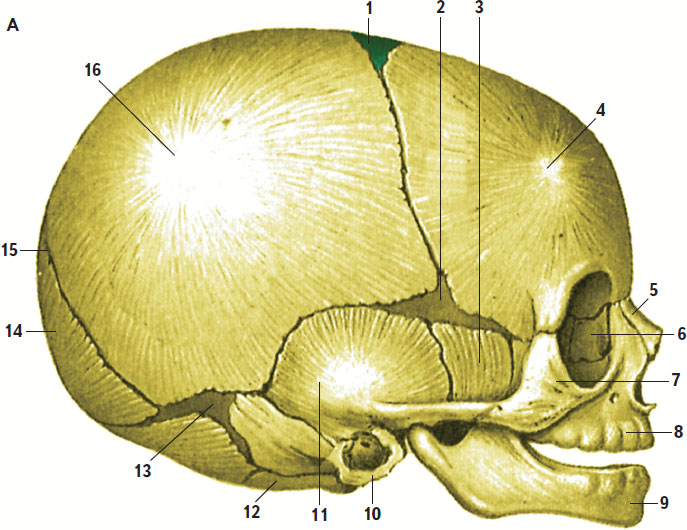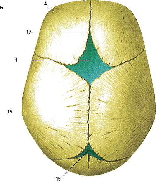 1 – передний родничок; 2 – клиновидный родничок; 3 – большое крыло клиновидной кости; 4 – лобный бугор; 5 – носовая кость; 6 – слезная кость; 7 – скуловая кость; 8 – верхняя челюсть; 9 – нижняя челюсть; 10 – барабанное кольцо височной кости; 11 – чешуйчатая часть височной кости; 12 – латеральная часть затылочной кости; 13 – сосцевидный родничок; 14 – затылочная чешуя; 15 – задний родничок; 16 – теменной бугор; 17 – лобный шов