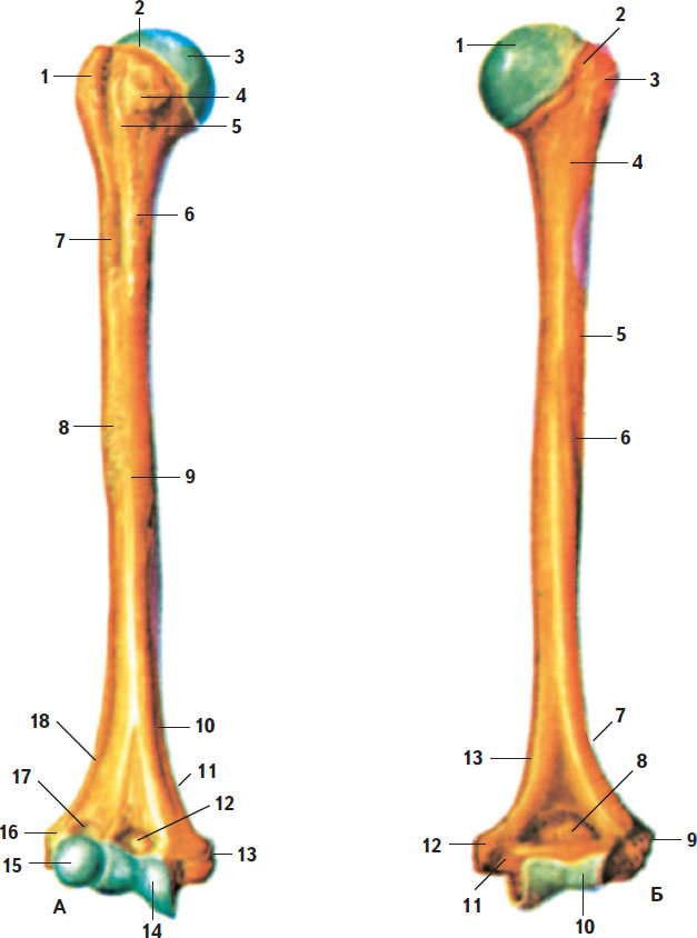 А – вид спереди: 1 – большой бугорок; 2 – анатомическая шейка; 3 – головка плечевой кости; 4 – малый бугорок; 5 – межбугорковая борозда; 6 – гребень малого бугорка; 7 – гребень большого бугорка; 8 – дельтовидная бугристость; 9 – тело плечевой кости; 10 – переднемедиальная поверхность; 11 – медиальный край; 12 – венечная ямка; 13 – медиальный надмыщелок; 14 – блок плечевой кости; 15 – головка мыщелка плечевой кости; 16 – латеральный надмыщелок; 17 – лучевая ямка; 18 – переднелатеральная поверхность; Б – вид сзади: 1 – головка плечевой кости; 2 – анатомическая шейка; 3 – большой бугорок; 4 – хирургическая шейка; 5 – дельтовидная бугристость; 6 – борозда лучевого нерва; 7 – латеральный край; 8 – ямка локтевого отростка; 9 – латеральный надмыщелок; 10 – блок плечевой кости; 11 – борозда локтевого нерва; 12 – медиальный надмыщелок; 13 – медиальный край плечевой кости