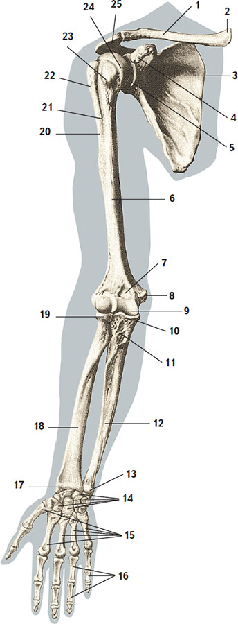 1 – ключица; 2 – грудинный конец ключицы; 3 – лопатка; 4 – клювовидный отросток лопатки; 5 – суставная впадина лопатки; 6 – плечевая кость; 7 – венечная ямка плечевой кости; 8 – медиальный надмыщелок; 9 – блок плечевой кости; 10 – венечный отросток локтевой кости; 11 – бугристость локтевой кости; 12 – локтевая кость; 13 – головка локтевой кости; 14 – кости запястья; 15 – I–V пястные кости; 16 – фаланги пальцев; 17 – шиловидный отросток лучевой кости; 18 – лучевая кость; 19 – головка лучевой кости; 20 – гребень большого бугорка; 21 – межбугорковая борозда; 22 – большой бугорок; 23 – малый бугорок; 24 – головка плечевой кости; 25 – акромион