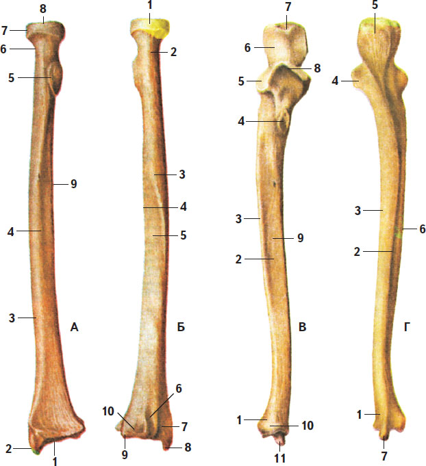 А: 1 – запястная суставная поверхность; 2 – шиловидный отросток; 3 – тело лучевой кости; 4 – передняя поверхность; 5 – бугристость лучевой кости; 6 – шейка лучевой кости; 7 – суставная окружность; 8 – головка лучевой кости; 9 – межкостный край; Б: 1 – суставная окружность (лучевой кости); 2 – шейка лучевой кости; 3 – тело лучевой кости; 4 – межкостный край; 5 – задняя поверхность; 6 – борозда мышцы – длинного разгибателя большого пальца кисти; 7 – борозда мышцы – лучевого разгибателя кисти; 8 – шиловидный отросток; 9 – локтевая вырезка; 10 – борозда мышц – разгибателей пальцев; В: 1 – головка локтевой кости; 2 – тело локтевой кости; 3 – межкостный край; 4 – бугристость локтевой кости; 5 – лучевая вырезка; 6 – блоковидная вырезка; 7 – локтевой отросток; 8 – венечный отросток; 9 – передняя поверхность локтевой кости; 10 – суставная окружность (головки локтевой кости); 11 – шиловидный отросток; Г: 1 – головка локтевой кости; 2 – тело локтевой кости; 3 – медиальная поверхность; 4 – венечный отросток; 5 – локтевой отросток; 6 – межкостный край; 7 – шиловидный отросток