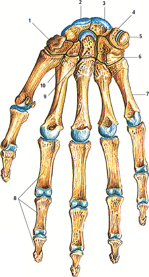 1 – кость-трапеция; 2 – ладьевидная; 3 – полулунная; 4 – трехгранная; 5 – гороховидная; 6 – крючковидная; 7 – пястная кость; 8 – фаланги пальцев; 9 – головчатая; 10 – трапециевидная