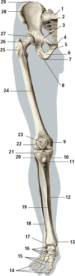 1 – крестец; 2 – крестцово-подвздошный сустав; 3 – верхняя ветвь лобковой кости; 4 – симфизиальная поверхность лобковой кости; 5 – нижняя ветвь лобковой кости; 6 – ветвь седалищной кости; 7 – седалищный бугор; 8 – тело седалищной кости; 9 – медиальный надмыщелок бедренной кости; 10 – медиальный мыщелок большеберцовой кости; 11 – бугристость большеберцовой кости; 12 – тело большеберцовой кости; 13 – медиальная лодыжка; 14 – фаланги пальцев; 15 – кости плюсны; 16 – кости предплюсны; 17 – латеральная лодыжка; 18 – малоберцовая кость; 19 – передний край большеберцовой кости; 20 – головка малоберцовой кости; 21 – латеральный мыщелок большеберцовой кости; 22 – латеральный надмыщелок бедренной кости; 23 – надколенник; 24 – бедренная кость; 25 – большой вертел бедренной кости; 26 – шейка бедренной кости; 27 – головка бедренной кости; 28 – крыло подвздошной кости; 29 – подвздошный гребень