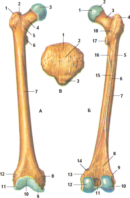 А – передняя поверхность; Б – задняя поверхность; В – надколенник; А: 1 – большой вертел; 2 – вертельная ямка; 3 – головка бедренной кости; 4 – шейка бедренной кости; 5 – межвертельная линия; 6 – малый вертел; 7 – тело бедренной кости; 8 – медиальный надмыщелок; 9 – медиальный мыщелок; 10 – надколенниковая поверхность; 11 – латеральный мыщелок; 12 – латеральный надмыщелок; Б: 1 – ямка головки бедренной кости; 2 – головка бедренной кости; 3 – шейка бедренной кости; 4 – большой вертел; 5 – ягодичная бугристость; 6 – латеральная губа шероховатой линии; 7 – тело бедренной кости; 8 – подколенная поверхность; 9 – латеральный надмыщелок; 10 – латеральный мыщелок; 11 – межмыщелковая ямка; 12 – медиальный мыщелок; 13 – медиальный надмыщелок; 14 – приводящий бугорок; 15 – медиальная губа шероховатой линии; 16 – гребенчатая линия; 17 – малый вертел; 18 – межвертельный гребень; В: 1 – основание надколенника; 2 – передняя поверхность; 3 – верхушка надколенника
