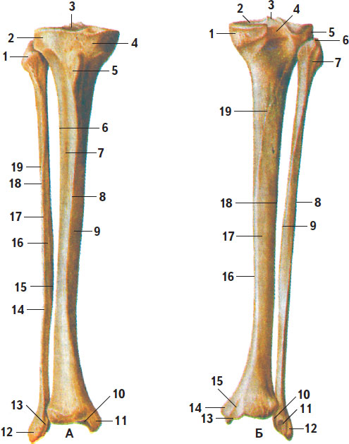 А: 1 – головка малоберцовой кости; 2 – латеральный мыщелок большеберцовой кости; 3 – межмыщелковое возвышение; 4 – медиальный мыщелок; 5 – бугристость большеберцовой кости; 6 – межкостный край; 7 – латеральная поверхность; 8 – передний край; 9 – медиальная поверхность; 10 – суставная поверхность лодыжки; 11 – медиальная лодыжка; 12 – латеральная лодыжка (малоберцовой кости); 13 – суставная поверхность лодыжки (латеральной); 14 – тело малоберцовой кости; 15 – медиальный (межкостный) край; 16 – медиальная поверхность; 17 – передний край; 18 – латеральный край; 19 – латеральная поверхность; Б: 1 – медиальный мыщелок; 2 – верхняя суставная поверхность; 3 – межмыщелковое возвышение; 4 – заднее межмыщелковое поле; 5 – латеральный мыщелок; 6 – верхушка головки малоберцовой кости; 7 – головка малоберцовой кости; 8 – тело малоберцовой кости; 9 – медиальный (межкостный) край; 10 – суставная поверхность лодыжки (малоберцовой кости); 11 – ямка латеральной лодыжки; 12 – борозда латеральной лодыжки; 13 – суставная поверхность медиальной лодыжки; 14 – медиальная лодыжка; 15 – лодыжковая борозда (борозда медиальной лодыжки); 16 – медиальный край большеберцовой кости; 17 – тело большеберцовой кости; 18 – латеральный (межкостный) край большеберцовой кости; 19 – линия камбаловидной мышцы