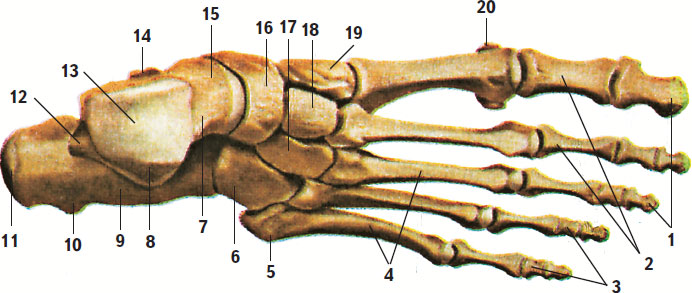 1 – дистальные (ногтевые) фаланги; 2 – проксимальные фаланги; 3 – средние фаланги; 4 – кости плюсны; 5 – бугристость V кости плюсны; 6 – кубовидная кость; 7 – таранная кость; 8 – латеральная лодыжковая поверхность; 9 – пяточная кость; 10 – латеральный отросток бугра пяточной кости; 11 – бугор пяточной кости; 12 – задний отросток таранной кости; 13 – блок таранной кости; 14 – опора таранной кости; 15 – шейка таранной кости; 16 – ладьевидная кость; 17 – латеральная клиновидная кость; 18 – промежуточная клиновидная кость; 19 – медиальная клиновидная кость; 20 – сесамовидная кость