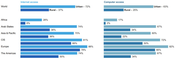 Рисунок 3. Доступ к Интернету и компьютерам в городах и сельской местности (CIS – Содружество Независимых Государств)