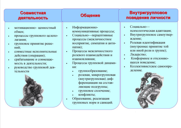 2. Динамика групповой жизни (групповые социально-психологические процессы деятельности, общения и внутри коллективного поведения отдельных членов коллектива) (см. таблица №1).