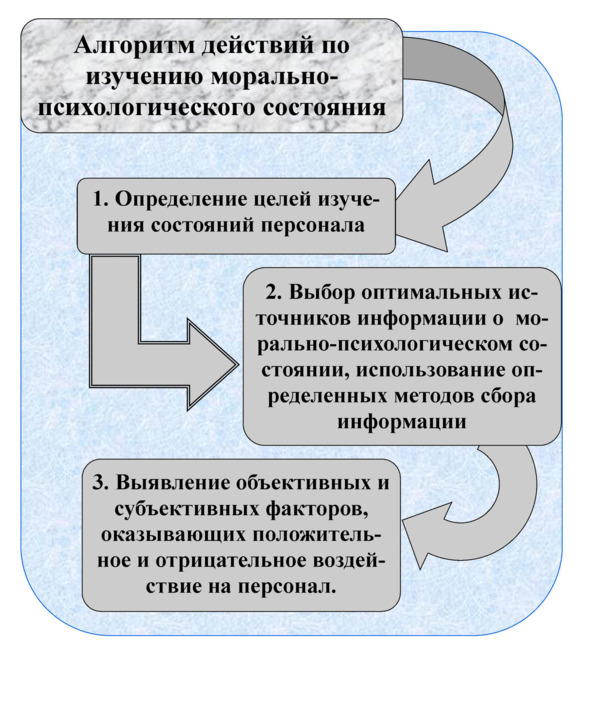 С проблемой оценки морально-психологического состояния тесно связано и его прогнозирование, так как только оно помогает объективно определить свои возможности и последующие периоды деятельности. Однако что такое прогноз? – это знание о возможных состояниях изучаемого объекта. Он предполагает знания о законах развития или тенденциях будущего состояния объекта. Прогноз