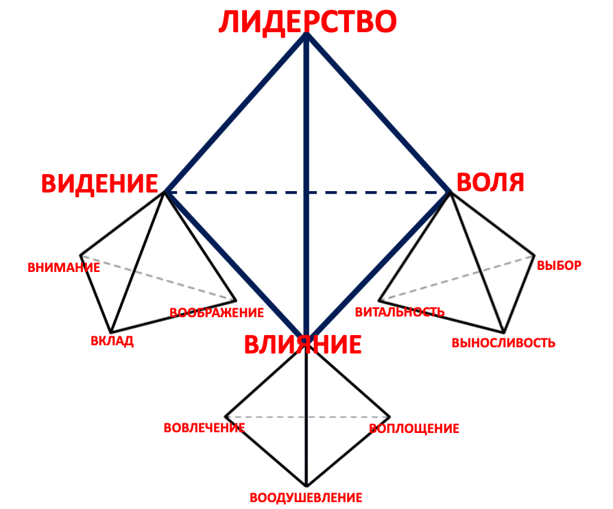 Еще раз: это просто схема. Одна из… Таких схем, более или менее интересных, вы при желании найдете множество. Здесь важно просто найти то, что ближе и понятнее самому. Предлагаю пока отталкиваться от данной схемы. Но может быть вы найдете пару минут, чтобы сформулировать и нарисовать собственный вариант составляющих лидерства. Это хорошая гимнастика для ума, настраивающая нас на важное.