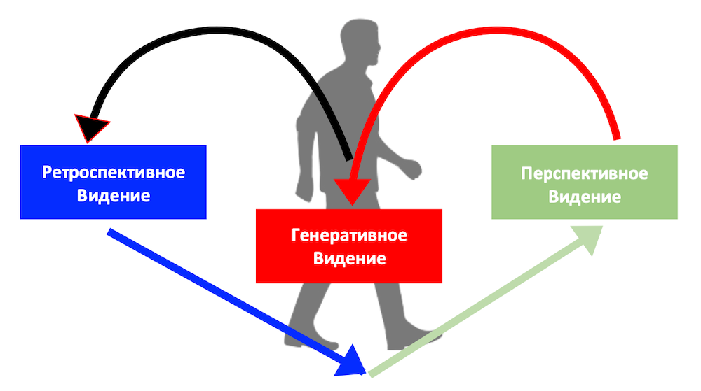 Предлагаю рассмотреть три ракурса Видения. И да, нам в целом требуется именно Генеративное. То, что освещает актуальную перспективу. Это наш будущий двигатель. Но чтобы оно, это Видение, считывалось окружением как конгруэнтное, важно, чтобы оно исходило из двух источников: из вашего будущего и из вашего прошлого. На схеме я обозначил эти источники, соответственно как Перспективное Видение и Ретроспективное.