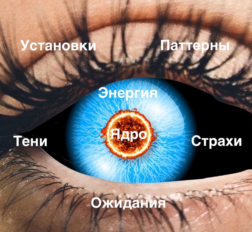 В общем, чтобы понять свои основные, ведущие импульсы, необязательно доставать до дна – здесь вы решаете сами. Для вполне достойного результата нам достаточно будет поработать с несколькими основными темами (а можно пойти и глубже, к Ядру). Все темы перечислены на следующей иллюстрации – это человеческий глаз, собственно, символизирующий, по мнению автора, видение. А заодно и краткое содержание того, чем мы займемся в этой ретроспективной части.