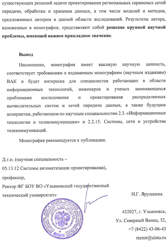 Несомненно, монография имеет достаточно весомое научное значение, соответствует требованиям к издаваемым монографиям (научным изданиям) ВАК и будет интересна для специалистов работающих в области информационных технологий, инженеров и ученых занимающихся проблемами исследования и проектирования распределенных вычислительных систем и сетей передачи данных, а также будущим аспирантам, работающим по научным специальностям 2.3. «Информационные технологии и телекоммуникации» и 2.2.15. Системы, сети и устройства телекоммуникаций.