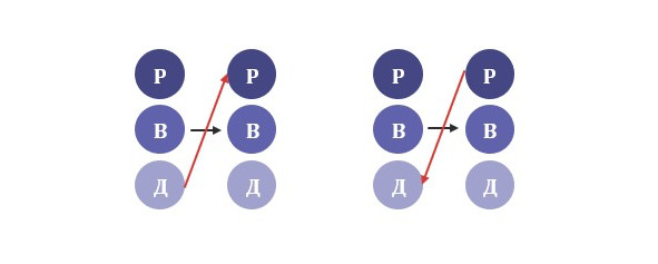 Перекосы происходят в пересечениях. Когда Взрослый одного обращается к Взрослому другого, а собеседник реагирует как Ребенок на Родителя. Например, просит.