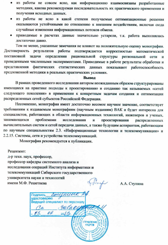Несомненно, монография имеет достаточно весомое научное значение, соответствует требованиям к издаваемым монографиям (научным изданиям) ВАК и будет интересна для специалистов работающих в области информационных технологий, инженеров и ученых занимающихся проблемами исследования и проектирования распределенных вычислительных систем и сетей передачи данных, а также будущим аспирантам, работающим по научным специальностям 2.3.1. «Системный анализ, управление и обработка информации, статистика» и научной специальности, Паспорт специальности 2.3.2. Вычислительные системы и их элементы, 2.3.3. «Автоматизация и управление технологическими процессами и производствами» и 2.2.15. Системы, сети и устройства телекоммуникаций.