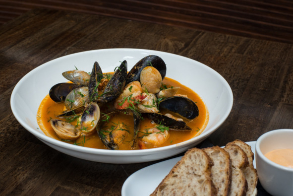 Бульон и мясо моллюсков добавьте к овощам, которые тушатся на второй сковороде. Посолите, добавьте сушеные травы по вкусу.