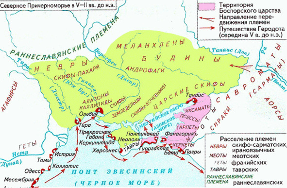 Скифами по античной традиции в византийской литературе называли племена, жившие в степях Причерноморья и в Крыму. (районе Сев. Причерноморья). Есть и карты, разработанные исследователями на основании древних письменных данных. Cмотрим на карту и знакомимся с отрывками из книги Геродота с комментариями исследователей и делаем собственные выводы- комментарии. Скифия на карте (автор Б. Н. Граков) обозначена зелёным цветом. Территории каких государств сейчас, где была территория Скифии, нетрудно вычислить.