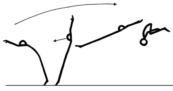 На рис. 3.6 показан момент перехода в полет при исполнении «затяжного» сальто назад. Особенность этого упражнения – в намеренном снижении активности вращения тела в полете, когда прыгун до возможного предела оттягивает по времени визуальный эффект сальто (собственно переворота через голову) и форсирует его лишь в самый последний, «критический» момент полета за счет плотного группирования. В данном случае ограничение «крутки» с самого начала упражнения задается преднамеренной установкой на ослабленное разгибание тела еще во время отталкивания от опоры, чему содействует некоторый наклон головы на грудь. Этот последний режим распределения тонуса может быть назван «ограничивающим». По смыслу он противоположен всем предыдущим режимам и вместе с ними может становиться фактором рационального управления двигательными действиями при обучении.