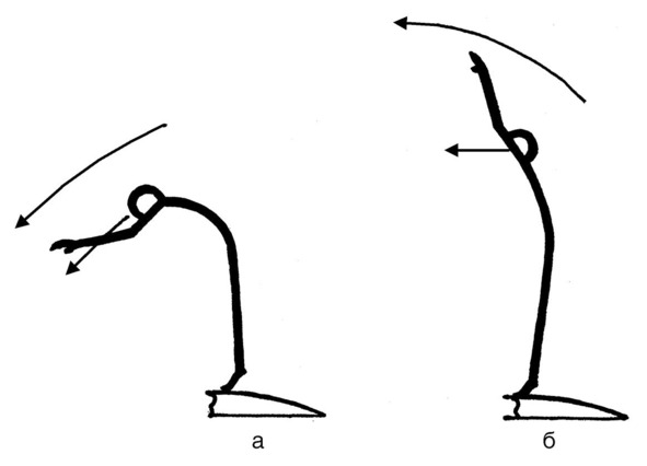 На рис. 3.7 изображен типичный пример из сферы акробатики. Осваивая сальто вперед с разбега, новичок часто стремится форсировать события, торопясь перейти в группированное положение и согнуться. Спортсмену кажется, что сальто, которое должно выполняться в группировке, от этого выиграет (а). Как следствие, еще при отталкивании он наклоняет голову вперед и, действительно, сгибается, получая в результате бесперспективное движение с ускоренным вращением, но очень низкое и краткое по времени. Чтобы исправить эту ошибку, иногда бывает достаточно одного указания на изменение положения головы, которая должна быть и в наскоке, и в отталкивании расположена прямо (б), а «на грудь» берется только после отчетливо осознанного и действительно произошедшего перехода в полет.