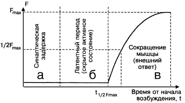 Скорость возбуждения мышцы. Для того чтобы в процессе нервно-мышечной передачи возник необходимый потенциал действия мышечного волокна и произошло само сокращение мышцы, способное дать механический эффект, всегда требуется некоторое время. Величина этого временного отрезка соизмерима с длительностью важных двигательных действий в спорте.