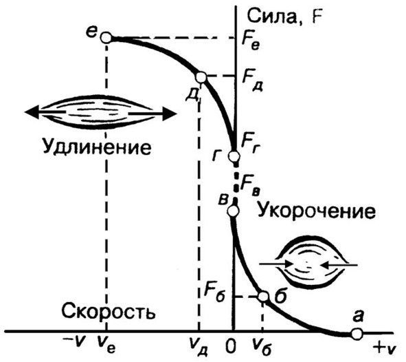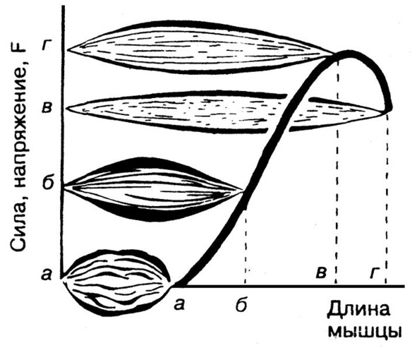 До известных пределов связь «длина-напряжение» носит почти линейный характер (а-в), и чем больше, в границах этой зоны, натяжение мышцы, тем больше ее напряжение. Напряжение сокращающейся мышцы максимально, если ее длина примерно на 20% больше т.н. «равновесной» длины, при ее полном покое и расслаблении (а). Однако, по достижении некоторого максимума увеличение длины мышцы не только не дает прироста напряжения, но вызывает его снижение (в-г). Это называется охранительная реакция мышцы.