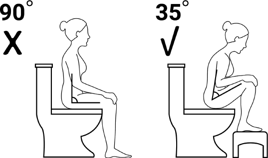 Конечно, проблему должен решать врач, но в раннем послеродовом периоде важно помогать себе ходить в туалет, регулярно опорожнять кишечник. Найдите удобное положение, как правило – это сидячая поза с чуть приподнятыми коленями, можно использовать невысокую скамеечку (см. иллюстрацию).
