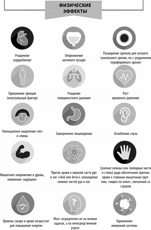 Использование гипноза, наведения образов и прогрессирующей мышечной релаксации (ПМР) увеличивает тонус парасимпатической системы и способно быстро подавить реакцию «бей или беги» в самых разных обстоятельствах, как это произошло с Бет. У этих методик множество самых различных преимуществ: они уменьшают тревогу и напряжение у родителей детей с раковыми заболеваниями[10], боль и утомление у проходящих курс химиотерапии[11], стресс у пациентов с рассеянным склерозом[12], тревогу и депрессию[13], частоту мигреней[14], головную боль тензионного типа[15], абстинентный синдром у людей, бросивших курить[16], постинсультное тревожное расстройство (в результате прослушивания расслабляющей музыки пять раз в неделю)[17] и фантомные боли в отсутствующих конечностях[18]. Они также повышают качество жизни пожилых людей[19], больных на диализе[20] и половую функцию у женщин после менопаузы[21].