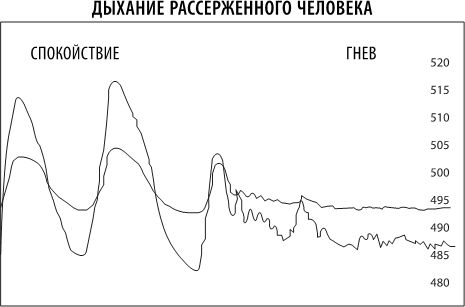 Крупная форма колебаний – результат измерения диафрагмального дыхания (по датчику натяжения вокруг живота); мелкая форма колебаний – результат измерения грудного дыхания (по датчику натяжения вокруг грудной клетки). В спокойном состоянии этот человек дышит животом, но когда он думает о конфликтной ситуации, ритм его дыхания нарушается, а доступ кислорода к мозгу значительно уменьшается. Не удивительно, что люди с таким ритмом дыхания подвержены вспышкам гнева и неразумному поведению.