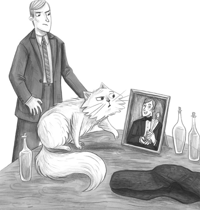 Макс решил пойти изучить закулисье. В Королевском театре Лондона это его любимое место. Он обожал сидеть на месте режиссёра-постановщика и смотреть, как рабочие при помощи декораций превращают сцену в опушку ночного леса или в замок с привидениями или даже в морские глубины. Кот прожил в Королевском театре уже больше года, но это действо по-прежнему казалось ему какой-то магией. По обеим сторонам сцены Оперы Мюзик было гораздо больше места, чем в Лондонском театре, но там не громоздились декорации и отсутствовали всяческие приспособления. Там стояло всего-навсего четыре стола. На трёх – имелось по бутылке воды и по стакану. На четвёртом – стояло несколько бутылок, лежал огромный шерстяной шарф и красовался портрет в серебряной рамке. На портрете красивый молодой человек, улыбаясь, держал хрустальный кубок. Максимилиан запрыгнул на стол, чтобы разобраться, кто это, но не обнаружил никаких подсказок. В отличие от Оскара, он так и не научился читать.