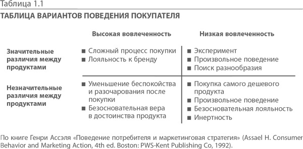 Приведенная ниже таблица (1.1) представляет варианты поведения в зависимости от уровня вовлечения и характеристики продукта. Понимая вероятные варианты поведения покупателя, вы, как маркетолог, используйте это при продаже своего продукта.