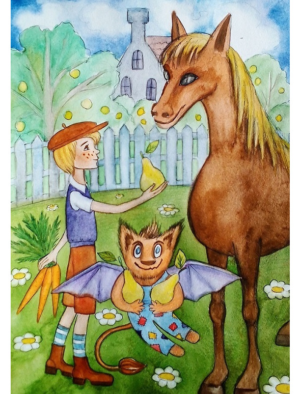 Сын Том оказался замечательным мальчиком. Он очень полюбил Квакахряма, показал ему свой сад. Квакахряма очень удивили деревья и кусты, похожие на шары, пирамидки и спирали. Его хорошо кормили, подарили настоящий домик с окошком и дверью. Днем Квакахрям летал по лесу и саду, а ночью спал в домике, так как было холодно. Еще Том брал Квакахряма с собой кататься на лошади. У Тома была своя лошадь в конюшне.