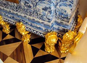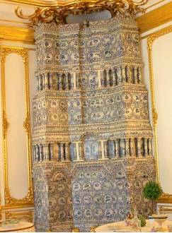 – Печь просто поставили в угол. Отделка стен не предусматривала печь, они из разных стилей, и печь явно появилась позже. Если посмотреть на верхнюю часть, то видно, что она не плотно прилегает к стене, поскольку ей мешает фигурная золочённая рельефная отделка верха стены. Такое чувство, что печку просто придвинули в угол.