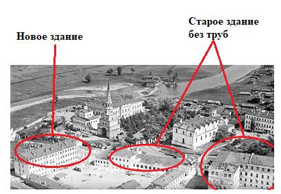 – Казанский Кремль. Нас больше интересует здание в правом нижнем углу – на его крыше полностью отсутствуют печные трубы. Обратите внимание на контраст – здания вокруг буквально испещрены трубами. Скорее всего, они были реконструированы и адаптированы под новые климатические условия, а вот здание без печных труб – пока не подверглось реконструкции.