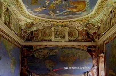 – Обратимся к максимально достоверным источникам. Дворец Палаццо Фарнезе, в Риме, был построен примерно в 1530 году. Одним из украшений в расписных залах, кроме великолепных фресок, стала подробная Карта Мира. Карта выполнена невероятно подробно: с руслами рек, городами, портами и достопримечательностями. Север Северной Америки опять какой то, словно ненастоящий.