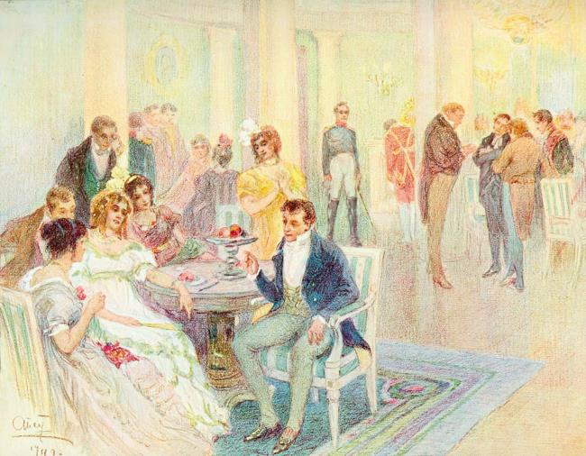 Vicomte [Виконт] рассказал очень мило о том ходившем тогда анекдоте, что герцог Энгиенский тайно ездил в Париж для свидания с m-lle George [мадмуазель Жорж], и что там он встретился с Бонапарте, пользовавшимся тоже милостями знаменитой актрисы, и что там, встретившись с герцогом, Наполеон случайно упал в тот обморок, которому он был подвержен, и находился во власти герцога, которой герцог не воспользовался, но что Бонапарте впоследствии за это-то великодушие и отмстил смертью герцогу.