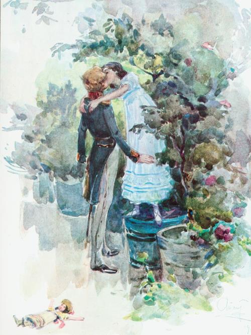 Она вдруг вскочила на кадку, так что стала выше его, обняла его обеими руками, так что тонкие голые ручки согнулись выше его шеи и, откинув движением головы волосы назад, поцеловала его в самые губы.