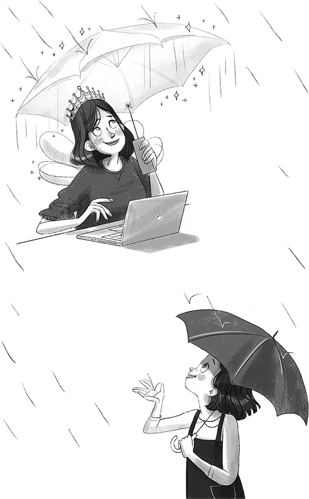 Однажды я сидела и смотрела, как мама брала урок волшебства по Видеомагосвязи у Фенеллы, своей феи-наставницы. Она разучивала погодное заклинание «Ливеньвызывайка», поэтому я сидела под зонтиком. И мамочка-фея тоже сидела под зонтиком, только волшебным, который парил над её головой сам по себе.