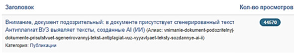 Рисунок 2 – Статья КонтрПлагиат: «Внимание, документ подозрительный: в документе присутствует сгенерированный текст – Антиплагиат. ВУЗ выявляет тексты, созданные AI (ИИ)»