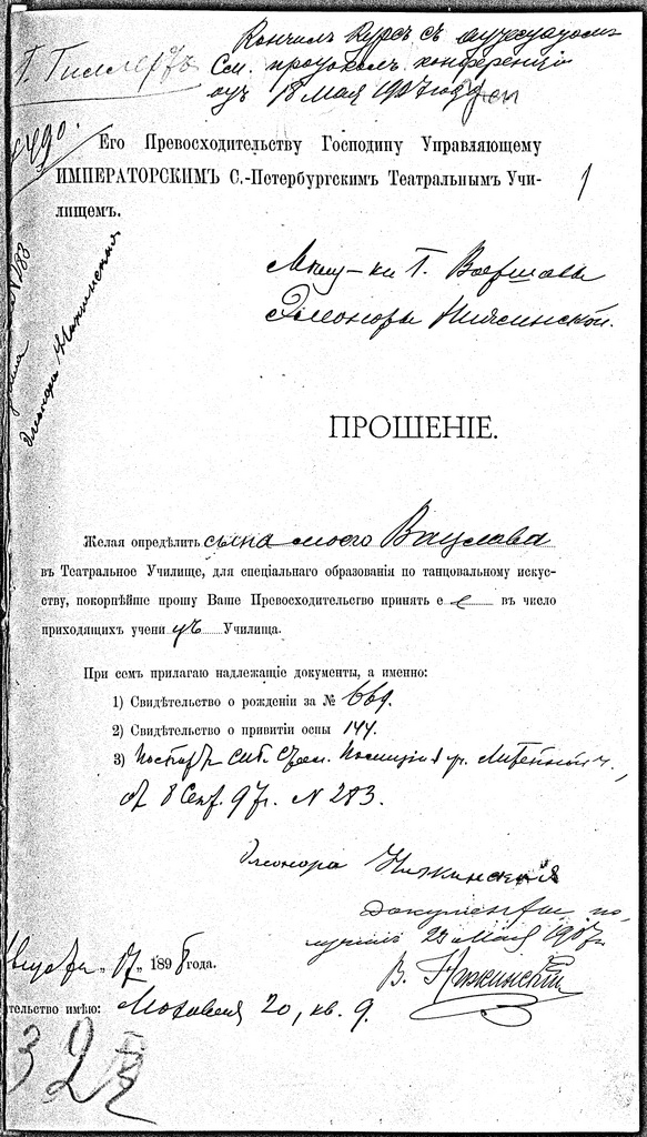 Прошение Элеоноры Нижинской от 17 августа 1898 года об определении её сына Вацлава Нижинского в Театральное Училище для специального образования по танцевальному искусству и принятии его в число приходящих учеников. Прошение написано на бланке женского отделения Училища, так как С. Гиллерт преподавал там. Его виза видна в правом верхнем углу. Также на документе присутствует автограф Вацлава Нижинского от 29 мая 1907 года: документы получил. Копия из личного архива автора. Публикуется впервые. (Источник: РГИА, Фонд 498, Опись 1, Дело 4903).