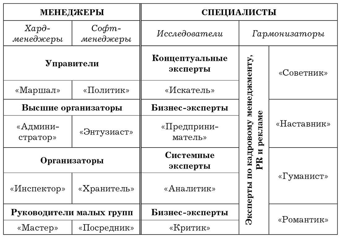 Всех людей можно условно разделить на руководителей (менеджеров) и специалистов. И те, и другие имеют свои подгруппы.