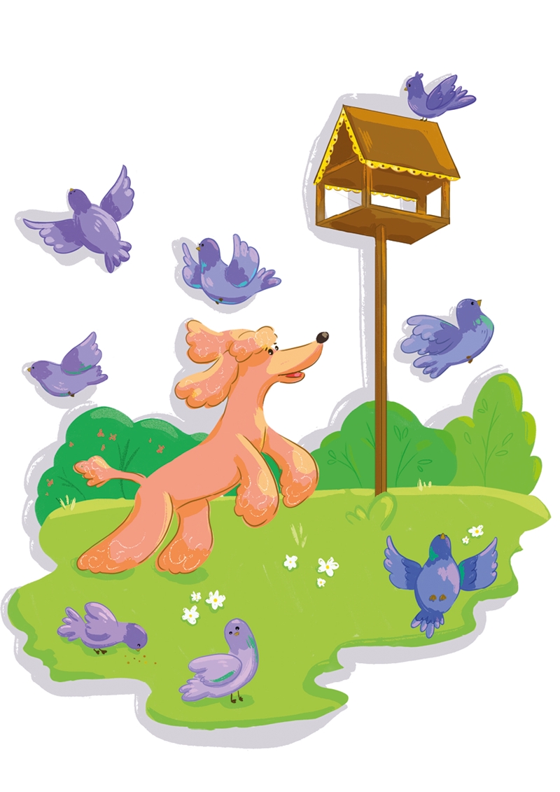 Приехав на дачу, щенок сильно обрадовался. Только он уже не удивлялся ни тени шмеля, ни толстобрюхой лягушке, как в первый раз на улице. Увидев большой соседский луг, он стремглав кинулся на него и от восторга давал круги один за другим. Казалось, Пегги разобьётся вдребезги или сломает лапу, если ему подвернётся какая-нибудь кочка. Но щенок проскочил весь луг, словно пролетел на крыльях. Сердечко его отчаянно билось. Хозяйка открыла дверь в дом, и пудель забежал на веранду. Всё было незнакомо щенку. Не понимая, что, где и как, он заскочил на диван, потом на кресло, как бешеный конь, хотел было вспрыгнуть на стол и сбить всё, что там стояло. Но хозяйка вовремя остановила его. Пегги бросался ей на руки, требуя поддержки и выхватывая всё, за что только она ни бралась. А она достала его еду и поставила у крылечка его миску.