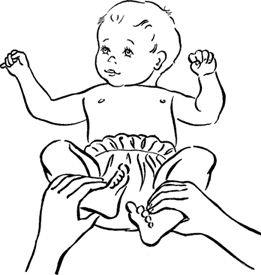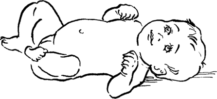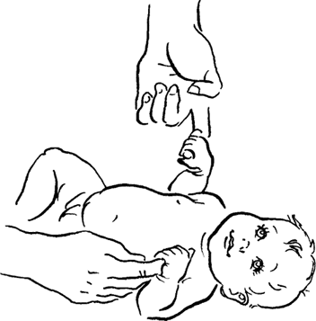 Двигательные реакции. Когда ребенок лежит на спине, его руки согнуты, прижаты к тельцу. Если вы захотите их развести в разные стороны, то сразу почувствуете, что малыш не дается вам просто так, оказывая сопротивление. При этом кулачки его сжаты, а большой палец находится внутри. Ножки тоже согнуты, слегка подтянуты к телу, и их тоже нужно разводить с некоторым усилием. Все это – проявления физиологического гипертонуса, с которым рождаются все малыши. Он естественно исчезает по мере адаптации ребенка к новым условиям.