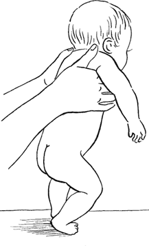 Рефлекс автоматический ходьбы. Если ребенка, взяв под мышки спинкой к себе, слегка опустить на ножки, так, чтобы он почувствовал опору, он начнет делать поступательные движения.