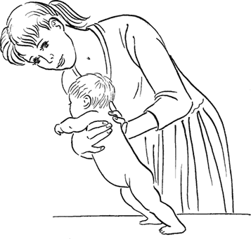 В том же положении под мышки спинкой к себе, слегка наклоните малыша. Он тут же «пойдет» – сделает ножками несколько реальных шажков.