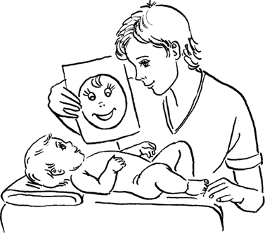Нарисуйте на листе бумаги веселую рожицу. Подносите этот листок бумаги к его лицу на расстояние 40–50 см, и вскоре вы увидите, что малыш будет улыбаться нарисованной рожице так же, как и вам.