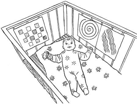 На стенках кроватки можно разместить картинки с разными узорами. Например, в виде шахматной доски, спирали, круги и волнистые полосы. Используя гуашь или другие яркие краски, нарисуйте сами линии шириной 1 см.