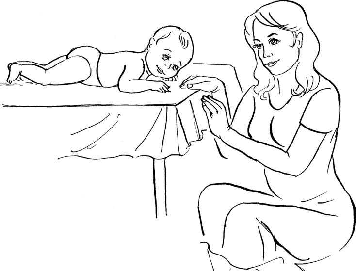 Выкладывая ребенка на животик, старайтесь находиться рядом с ним так, чтобы ваши головы были на одном уровне. Например, он лежит на столе, а вы стоите на коленях перед ним или сидите, в зависимости от высоты стола. Видя вас, малыш будет стараться удерживать голову. Так вы будете тренировать у него формирование шейного изгиба позвоночника. Можно это упражнение делать каждый день, его длительность определяется степенью комфортности малыша в этом положении. Как только он устает, меняйте его положение.