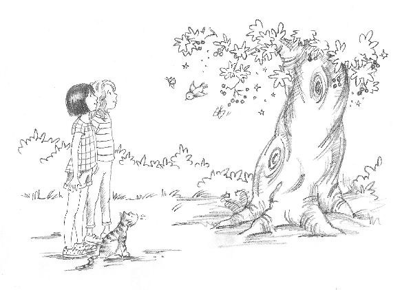 Но как только девочки подошли к нему, он ожил. На ветвях его появилась листва и алые ягоды, лазоревки радостно запели. Голди мяукнула и коснулась ствола. Тут же на нём появились вырезанные буквы. Девочки взялись за руки и прочитали вслух: