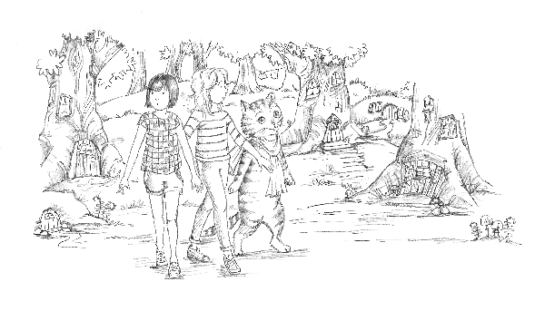 Сгорая от нетерпения, девочки последовали за кошкой. Хвостик у неё дёргался от волнения. Они шли мимо домиков, где жили лесные звери. Одни спрятались среди корней, другие в листве на ветках. Но никто из друзей-зверей им сегодня не махал, как обычно.